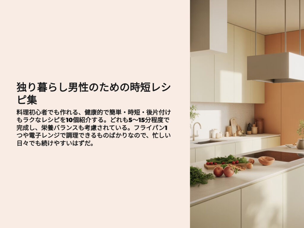 以下に「独り暮らしの男性向け」に特化した、健康的で簡単・時短・後片付けもラクなレシピを10個ご紹介します。
