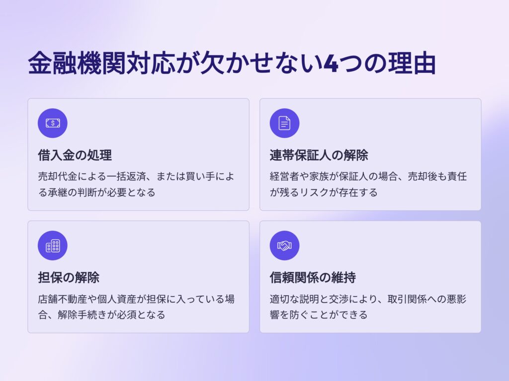 - 店舗不動産や個人資産が担保に入っている場合、売却に合わせて解除手続きが必要