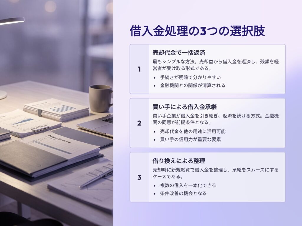 - 買い手企業が借入金を引き継ぎ、返済を続ける方式