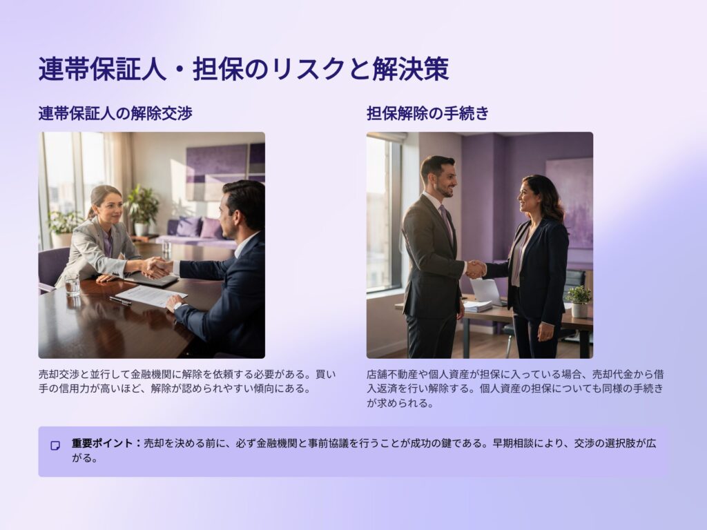 また、経営者本人や家族が「連帯保証人」になっている場合、売却後も保証が残ってしまうリスクがあります。