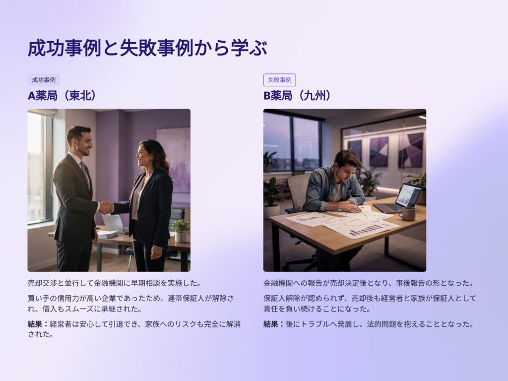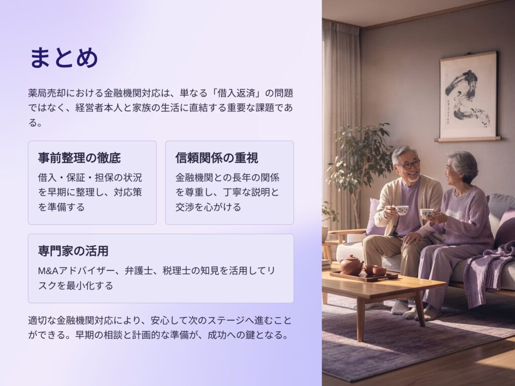薬局売却における金融機関対応は、単なる「借入返済」の問題ではなく、経営者本人と家族の生活に直結する重要な課題です。