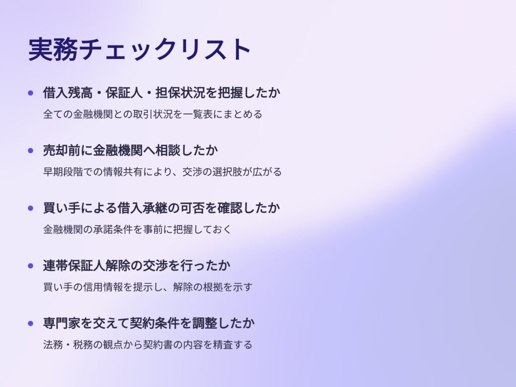 - 経営者やその家族が保証人となっている場合、売却後も保証責任が残る可能性