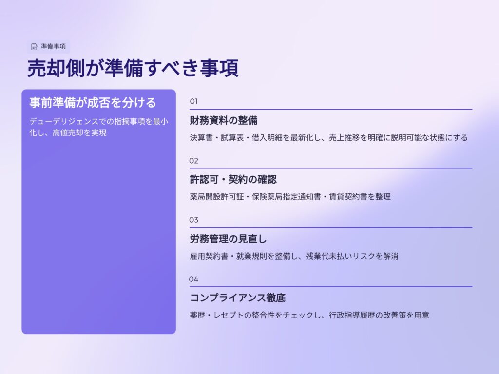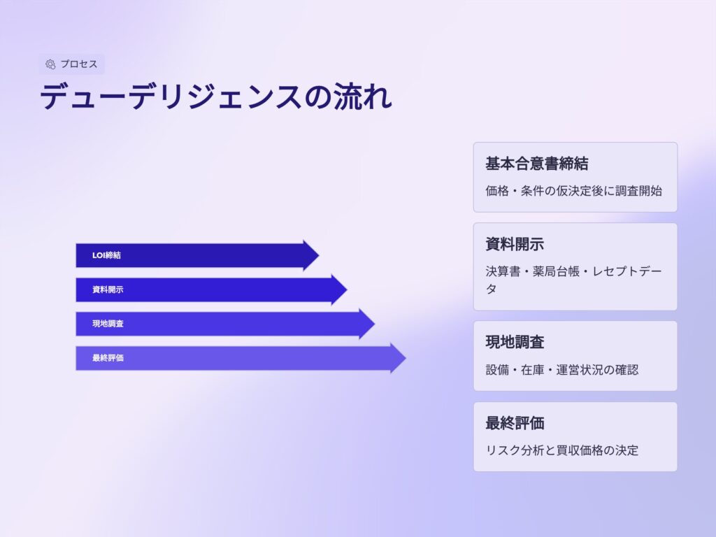 本記事では、薬局売却における買収監査(デューデリジェンス)の流れと、売却側が準備すべきポイントを整理します。