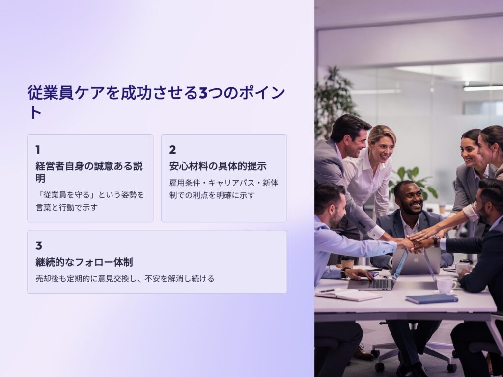 → 雇用条件・キャリアパス・新体制での利点を明確に示す - 継続的なフォロー体制