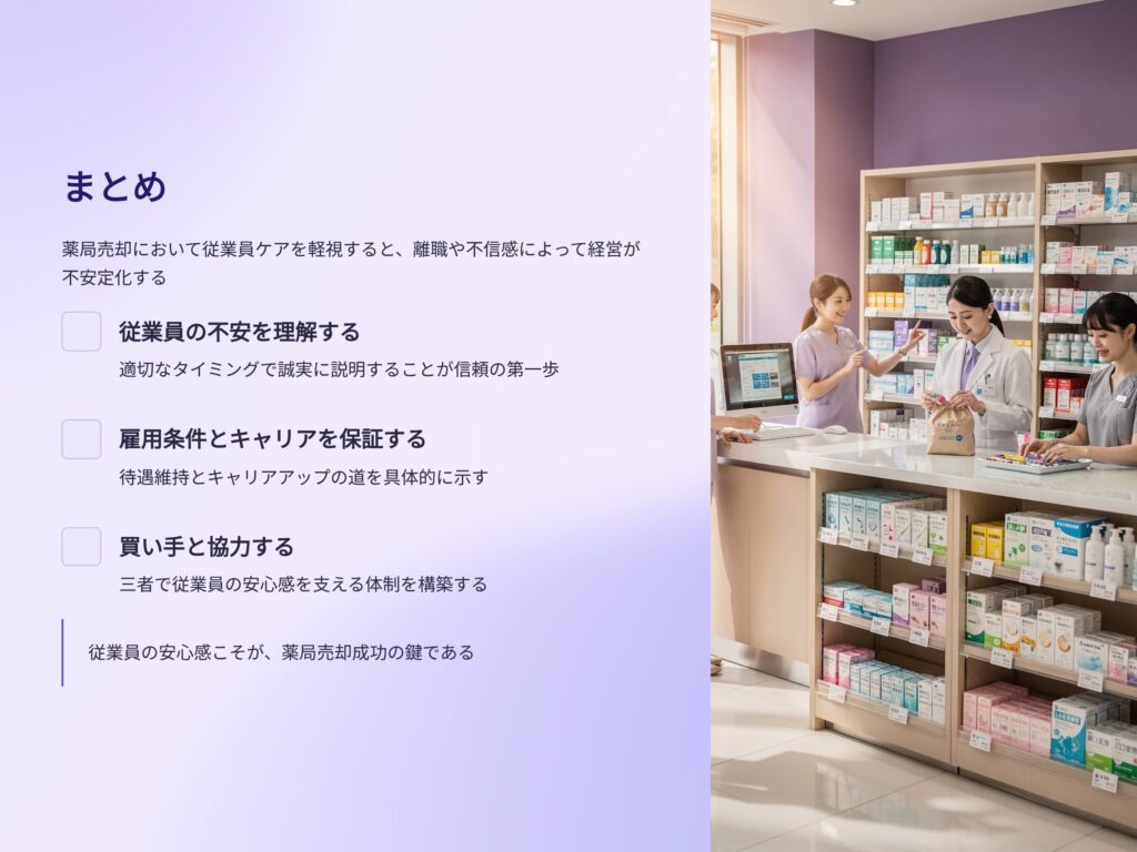 薬局売却において、最も大切なのは「従業員の安心感を守ること」です。