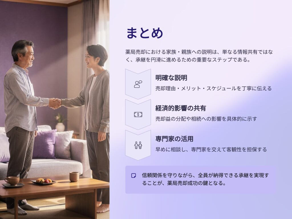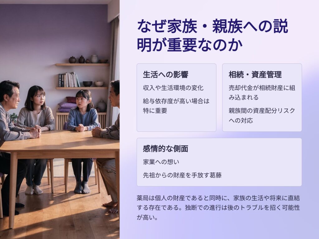 薬局売却における家族・親族への説明は、単なる情報共有ではなく、承継を円滑に進めるための重要なステップです。