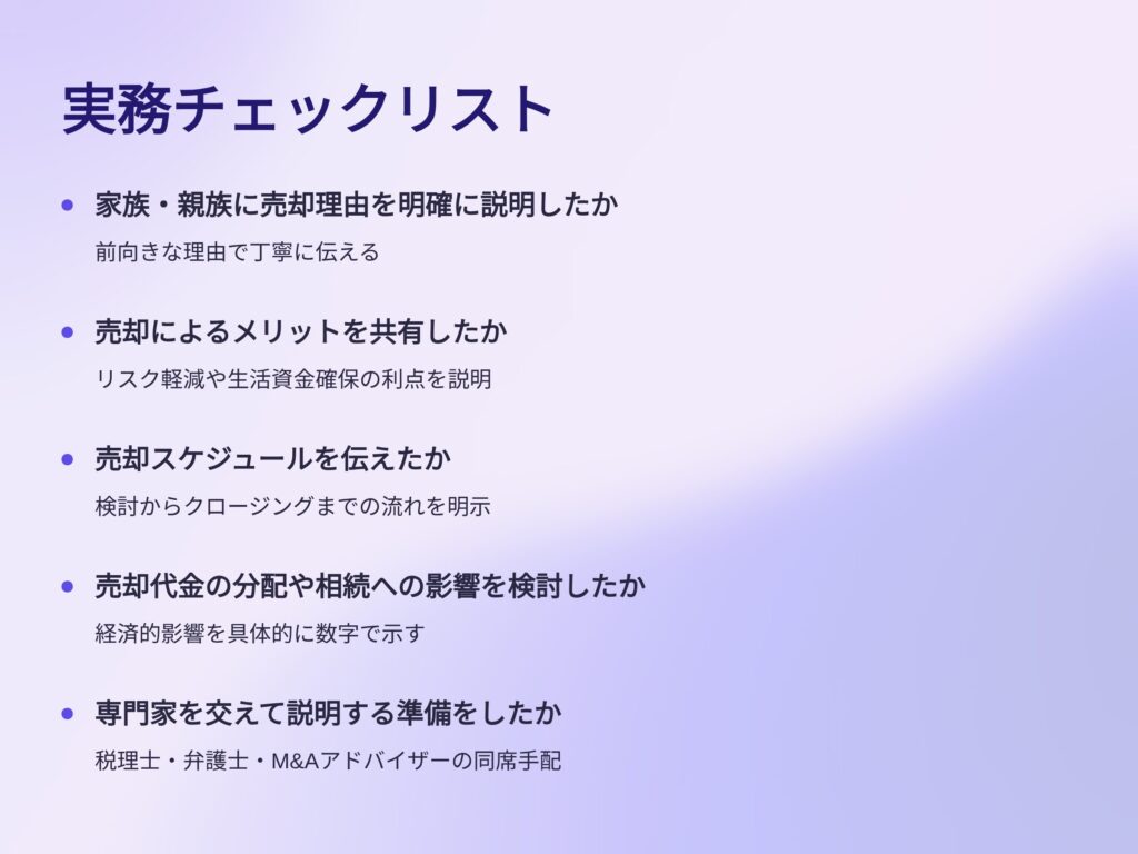 経営状況と売却理由を丁寧に説明し、税理士を交えて相続への影響も共有。