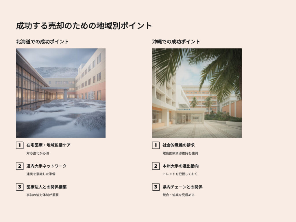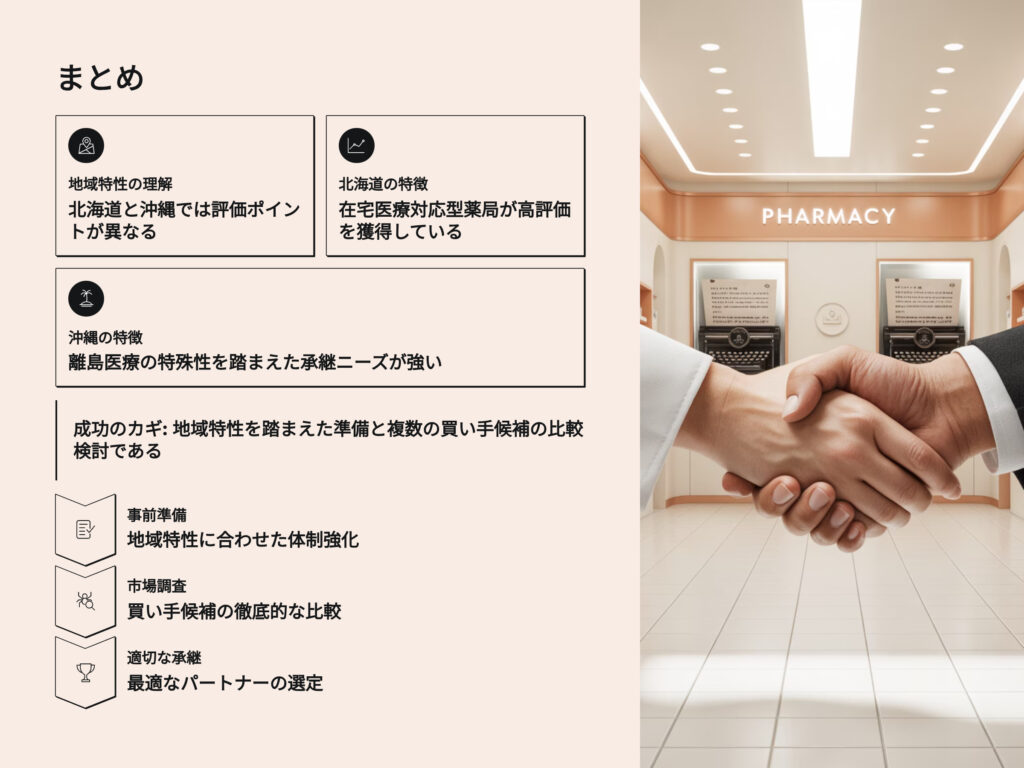 薬局売却は全国的に進んでいますが、北海道と沖縄は地域特性によって評価のポイントが異なることが分かります。
