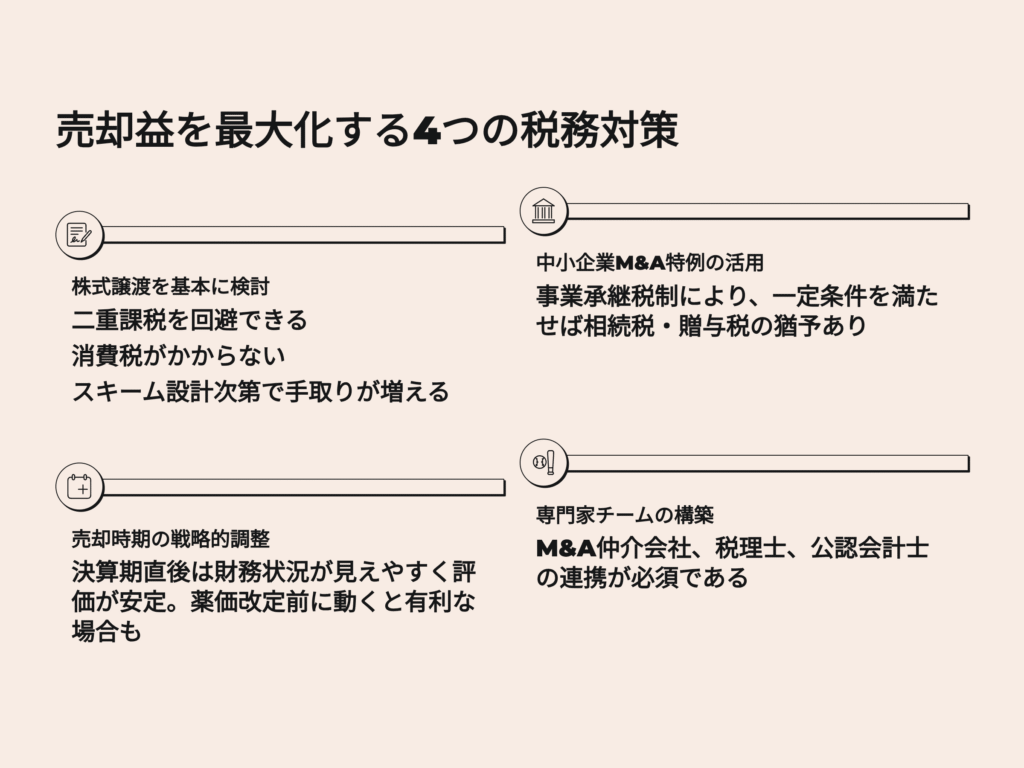 👉 ポイント:同じ売却でも「事業譲渡」か「株式譲渡」かで税金が大きく変わります。