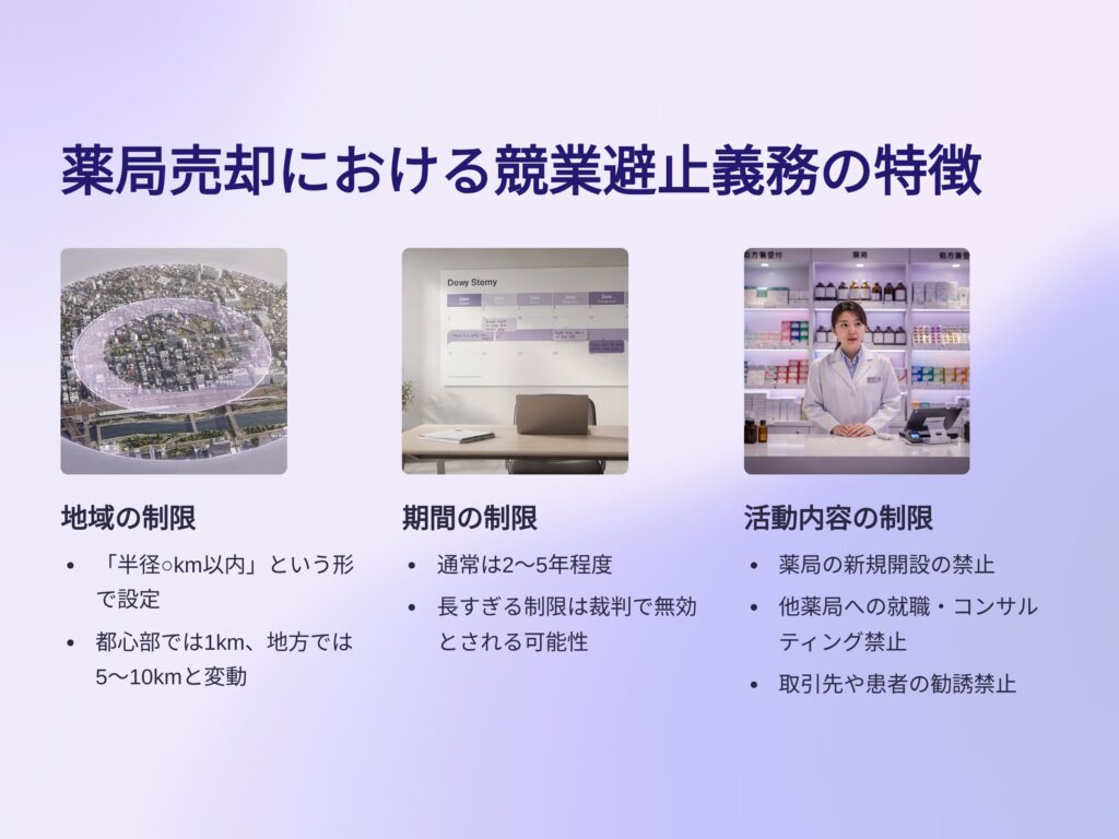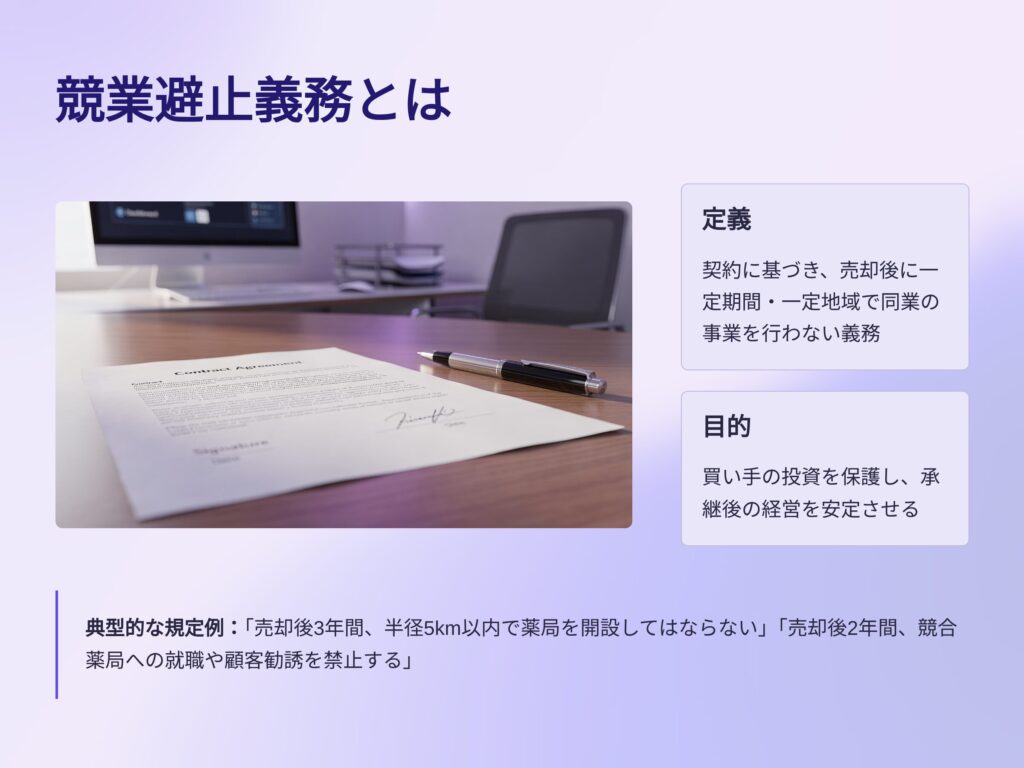 これは、薬局を売却した後に同じ地域や同業種で新たに薬局を開業したり、競合他社に協力したりすることを制限する義務を意味します。