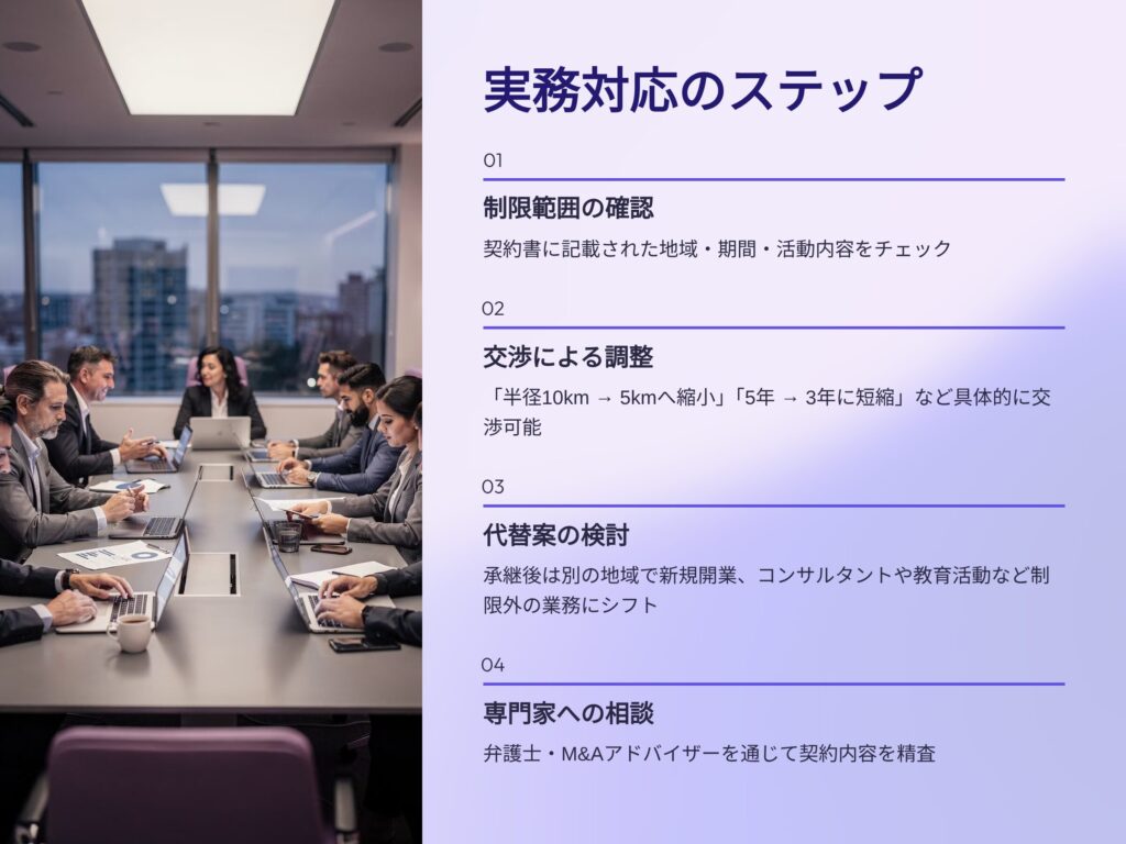 一方で売り手にとっては、将来の働き方や生活に大きな制約を与える可能性があり、交渉段階でしっかりと確認しておく必要があります。