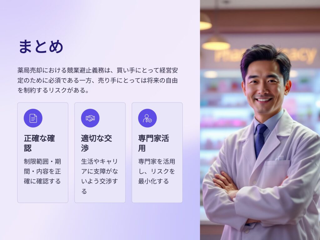 薬局売却における競業避止義務は、買い手にとって経営安定のために必須である一方、売り手にとっては将来の自由を制約するリスクがあります。