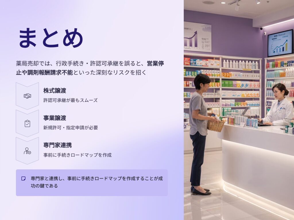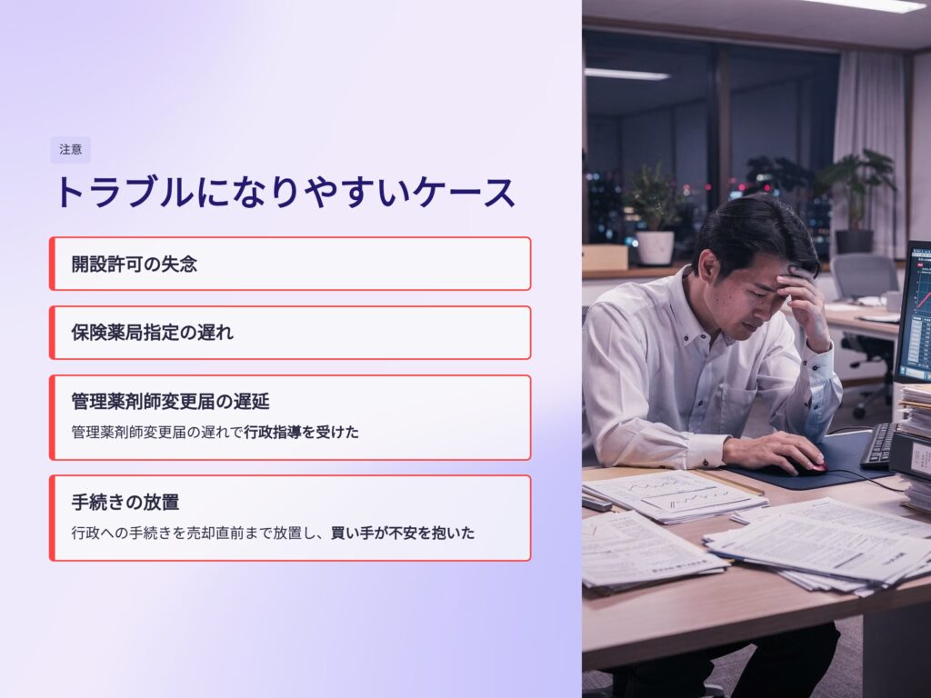 薬局売却では、行政手続き・許認可承継を誤ると、営業停止や調剤報酬請求不能といった深刻なリスクを招きます。