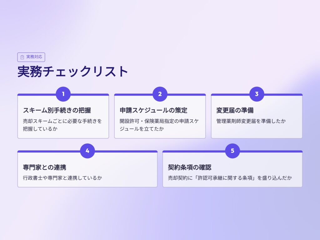 - 許認可は包括承継できないため、買い手が新たに薬局開設許可を取得する必要あり