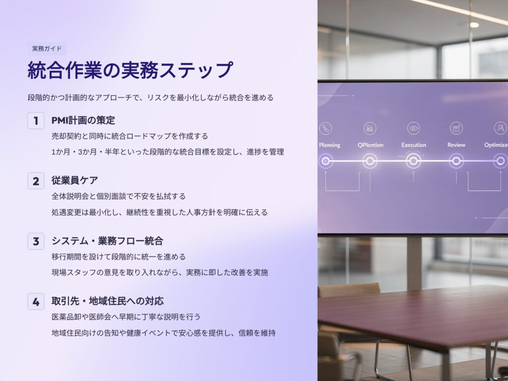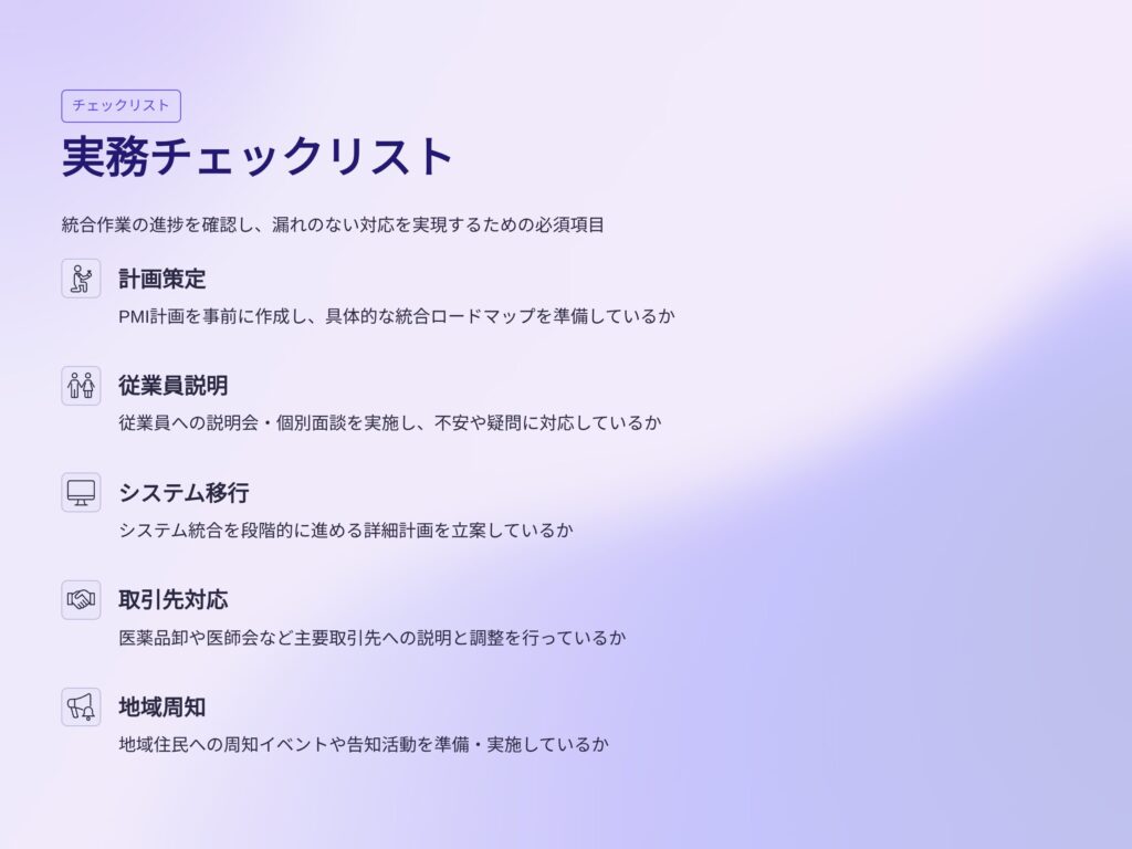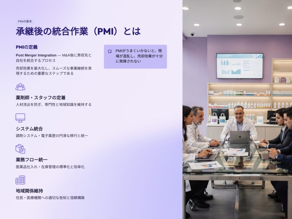 薬局売却における「統合作業(PMI)」は、単なる引き渡し手続きではなく、承継後の成功を左右する重要なプロセスです。