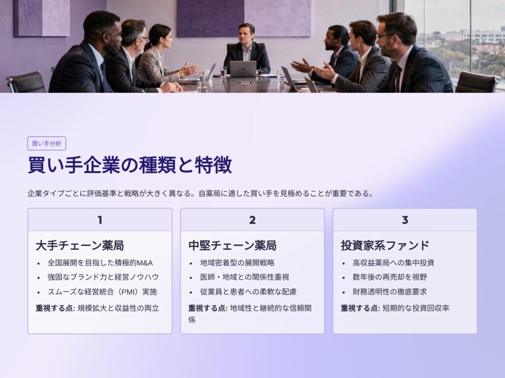 薬局売却において買い手企業は、単なる収益額ではなく「安定性・人材・地域連携・成長余地」を重視しています。