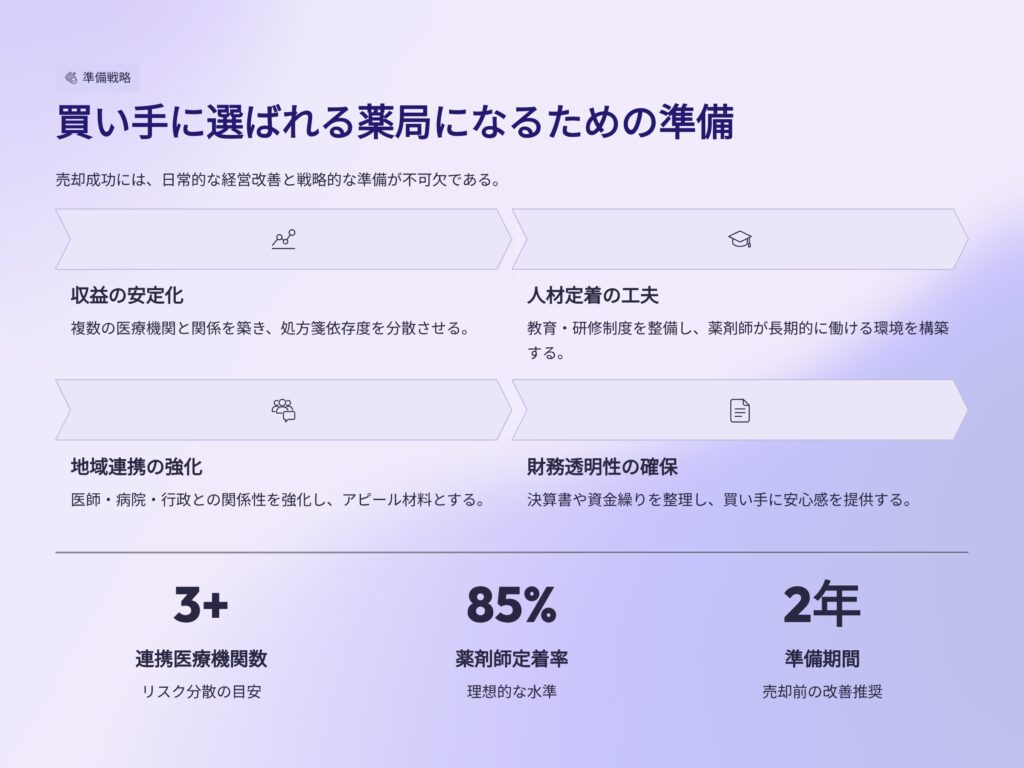 - 「選ばれる薬局」になるためには、売却前からの準備が不可欠