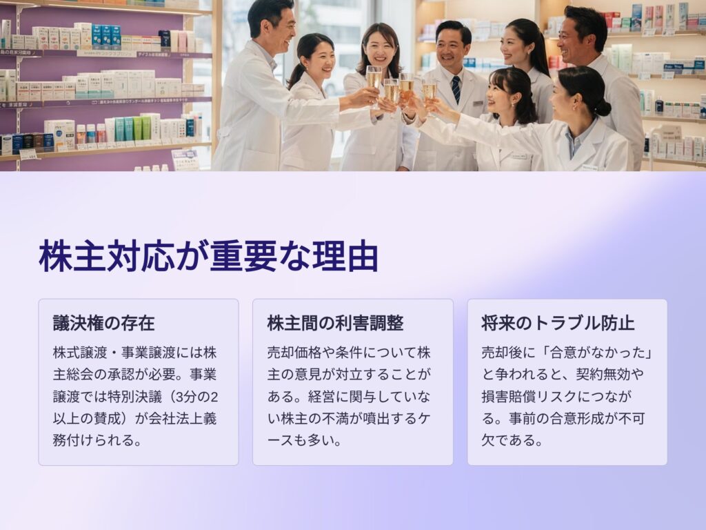 本記事では、薬局売却における株主対応の重要性と実務上のポイントを解説します。