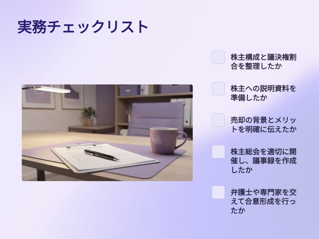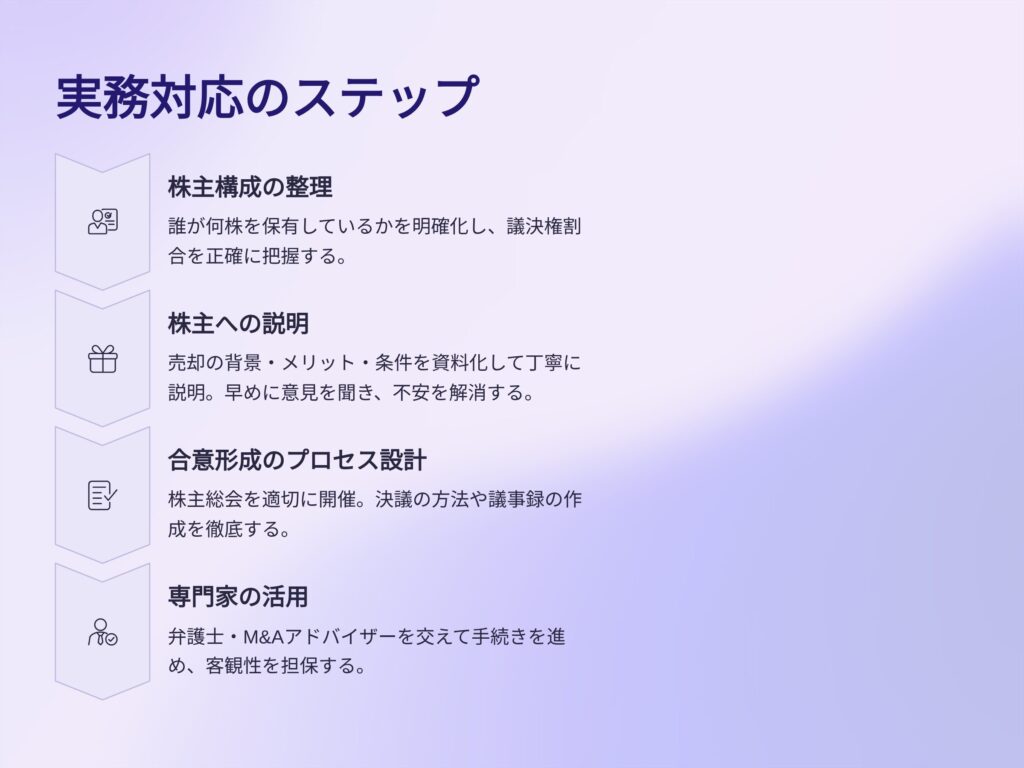 株主対応を誤ると、売却プロセスが停滞したり、後に法的トラブルへ発展したりする可能性があります。