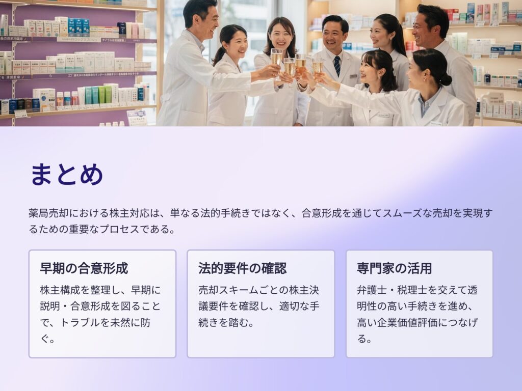 薬局売却における株主対応は、単なる法的手続きではなく、合意形成を通じてスムーズな売却を実現するための重要なプロセスです。