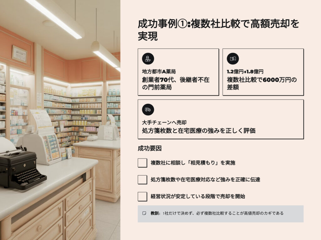 ある地方都市の門前薬局A社は、創業者が70代に差し掛かり後継者不在のため売却を検討しました。