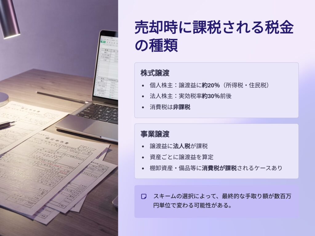 売却益に対する課税はもちろん、スキーム選択によって税負担が大きく変わるため、適切な対策をとらなければ「想定以上の税金が発生して手元資金が残らない」という事態に陥りかねません。