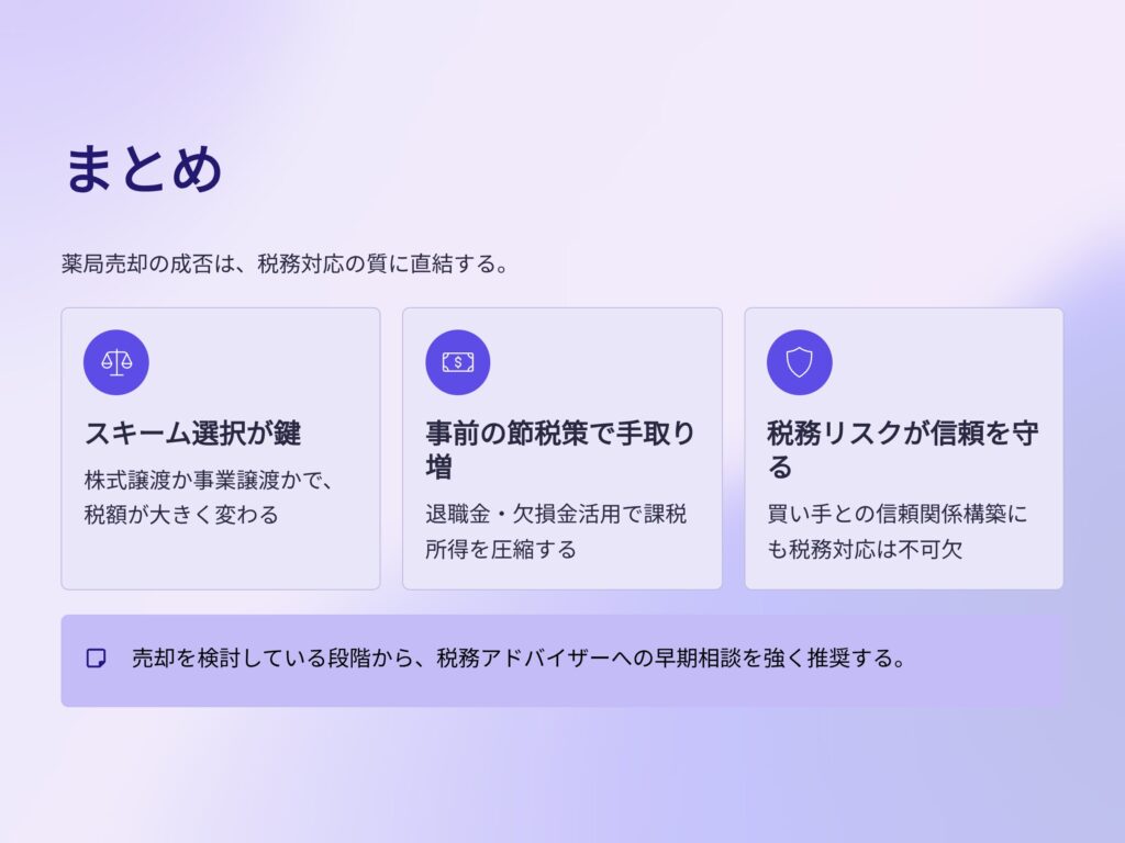薬局売却と税務対応は、経営者の最終的な利益に直結する重要テーマです。